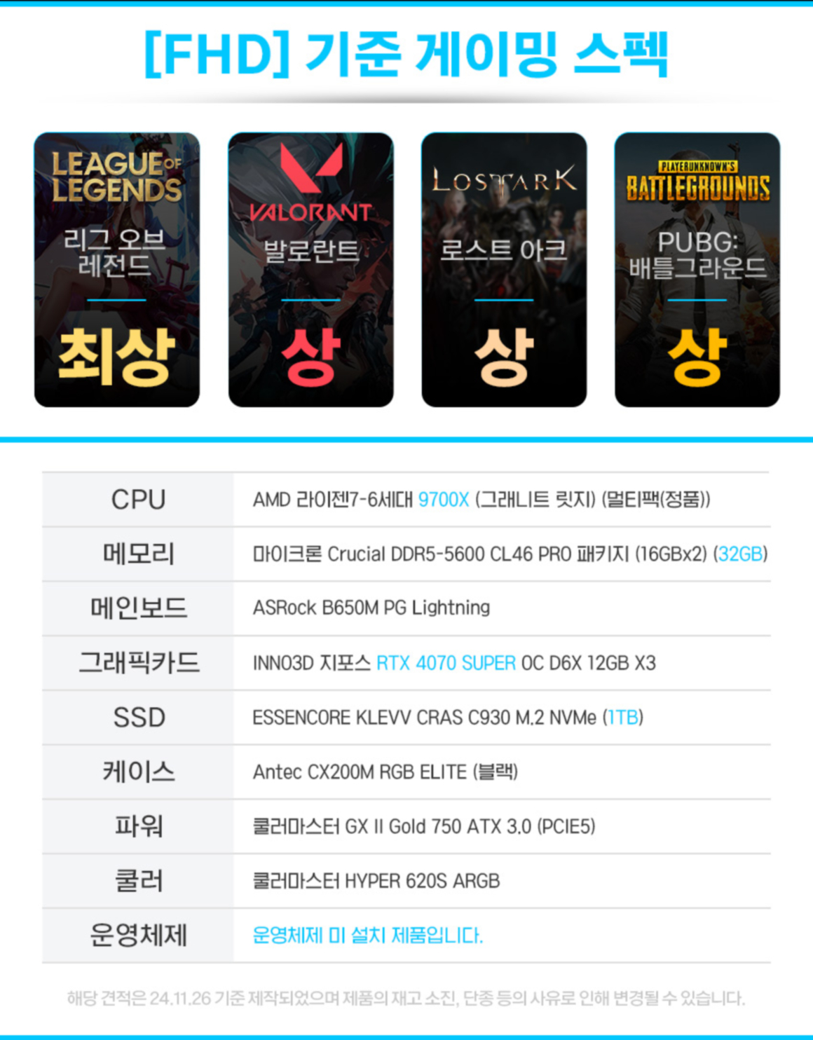 2025년 추천PC OK 9700X RTX4070S 게이밍 본체 GY110 오버워치 350 프레임 배그 300 프레임 가능
